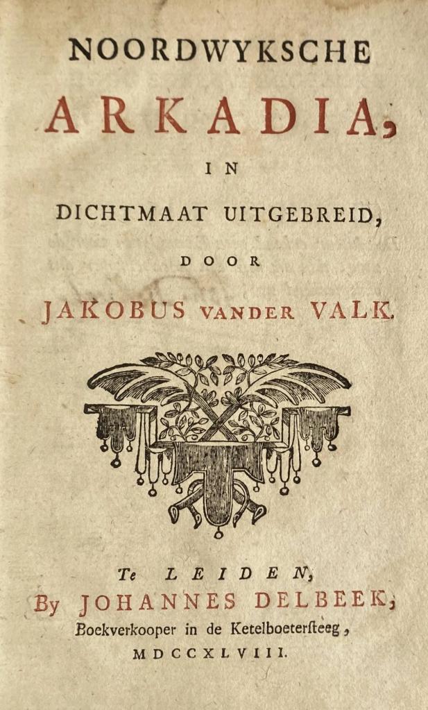 De eerste uitgave van ‘Noordwijksche Arkadia’, een ode aan Noordwijk in dichtvorm. We schrijven 1748. De dichter was Jakobus van der Valk en de uitgever Johannes Delbeek uit Leiden (uit de Ketelboetersteeg, een zijstraatje van de Breestraat).