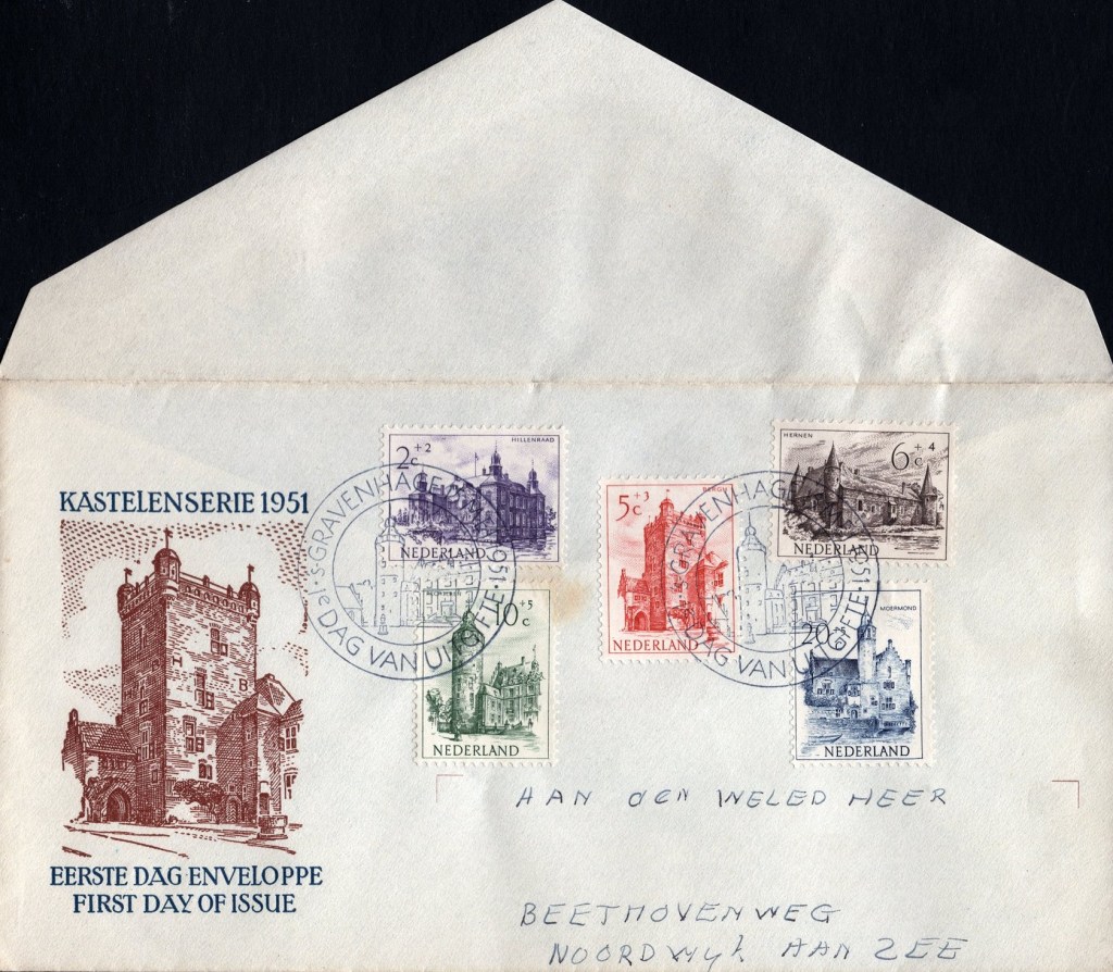 Eerste Dag Enveloppen, oftewel First Day Covers (FDC’s) vormen een apart verzamelgebied binnen de filatelie. Of dat nog steeds zo is, weet ik niet, want ik doe niet meer zo erg aan postzegels verzamelen. Deze Eerste Dag Envelop met de zomerzegels van 1951 wordt op catawiki ingezet op €15 en dat lijkt me aan de lage kant. Weliswaar is de envelop beschreven, en dat haalt de waarde omlaag, maar in mijn hele oude catalogus van 2002 staat deze beschreven envelop op de rol voor €260 (onbeschreven €910)! Deze envelop ging toe aan iemand die woonachtig was aan de Beethovenweg in Noordwijk aan Zee. Ter wille van de privacy heb ik ‘m maar geanonimiseerd.