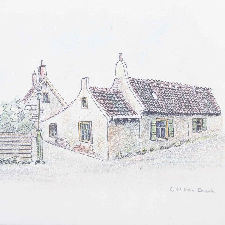 Kleurpotloodtekening van de Jan Kroonsweg in Noordwijk aan Zee door een mij onbekende kunstenaar: Cor van Duin. Te koop aangeboden door Museum Noordwijk op de site van de museumdepotshop. Ik had al eens eerder aandacht aan de werken van Cor besteed. Zie een eerder blog. Dezelfde Cor van Duin maakte van bovenstaand tafereel overigens ook een schilderij in olieverf: