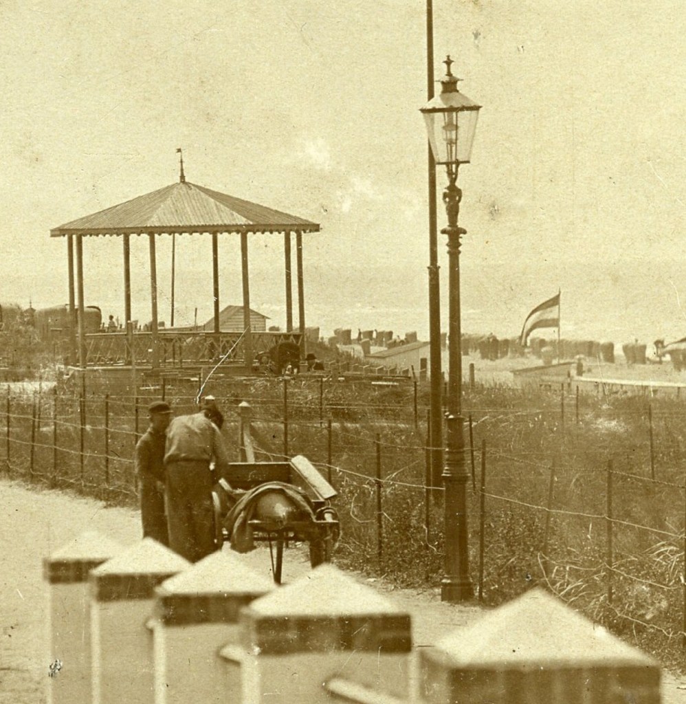 Als je inzoomt op een foto krijg meer oog voor details. Soms ook beroof je een foto dan van zijn context. Ieder voordeel heb zijn spreekwoordelijke nadeel. Twee mannen bij een handkar met op de achtergrond een muziektent: het is een mooi beeld, maar het kan overal zijn. Als je uitzoomt, zie je pas waar je bent: op de vroege Noordboulevard van Noordwijk aan Zee ergens in de tijd: