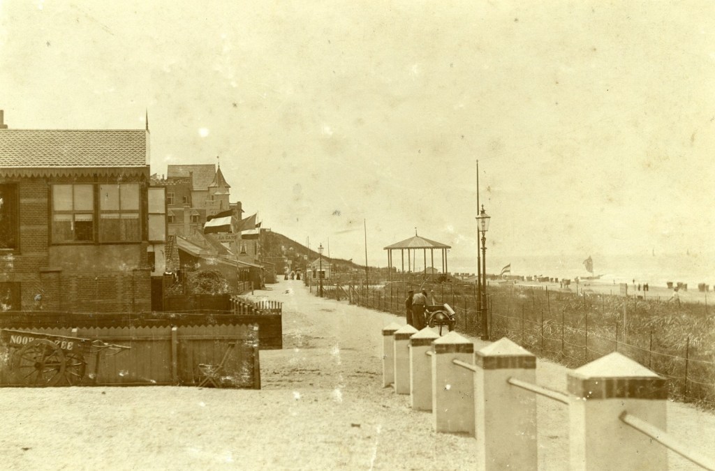 NOTA BENE Naar aanleiding van deze foto’s merkt Rein – onder dankzegging – nog het volgende op, specifiek over de muziektent: De muziektent stond voor badhotel Konijnenburg. Over de bouw ervan staat in de notulen van Crescendo van 18 augustus 1899 het volgende: ‘Het natuurschone dorp Noordwijk aan Zee dat jaarlijks het bezoek van vreemdelingen ziet vermeerderen met zijn brede strand en groene duinen, wil daarvoor ook wel enige dankbaarheid tonen om de badgasten, tijdelijk daar vertoevende, eens iets aan te bieden in de vorm van concerten. Daartoe namen enige pensionhouders het initiatief en wel de HH. H. Hoek, A. Verloop en N. De Hollander, die zich bereid verklaarden om met het muziekgezelschap ‘Crescendo’ samen te werken, zodat er een muziektent zou verschijnen op het terras voor het badhotel Konijnenburg en dat die gratis zou geleverd worden, terwijl Konijnenburg voor gratis consumpties zou zorgen, altijd aan de leden van de Crescendo.’ Verderop is in 1902 voor het eerst sprake van een concert op de muziektent. Jammer trouwens dat het hotel niet meer bestaat, die ‘gratis consumpties ALTIJD’ zouden met de huidige prijzen erg aantrekkelijk zijn.