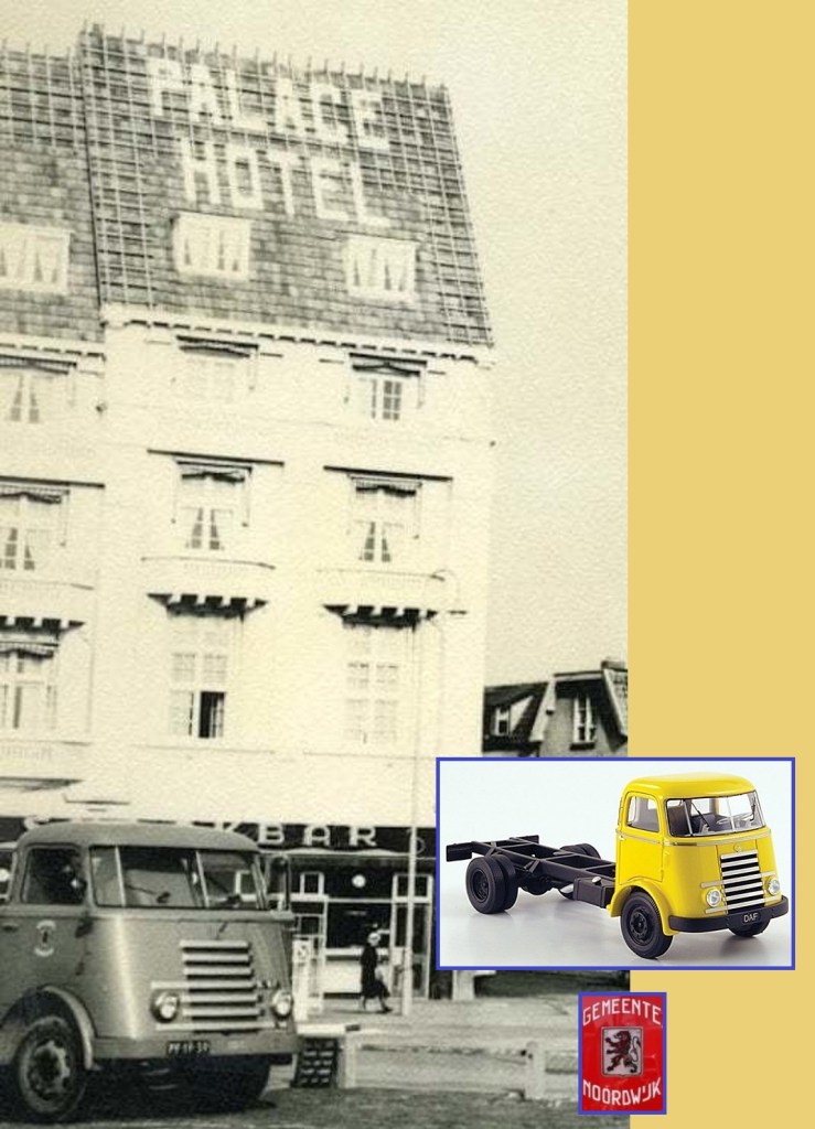 De gemeente Noordwijk had op enig moment tenminste één DAF-vrachtauto rondrijden. Het was een DAF van het type A30 uit 1949. Er zal wel enige logica zijn verbonden aan de aanschaf van een DAF (‘Koopt Nederlandse waar!’), maar het waren (en zijn) daarnaast ook best wel stoere vrachtwagens. Hier staat er één op het Palaceplein. Het voormalige logo van de gemeente staat nog op de deur (ik heb de versie op een rode achtergrond (van de brandweer) toegevoegd, maar in het echie was de achtergrond groen).