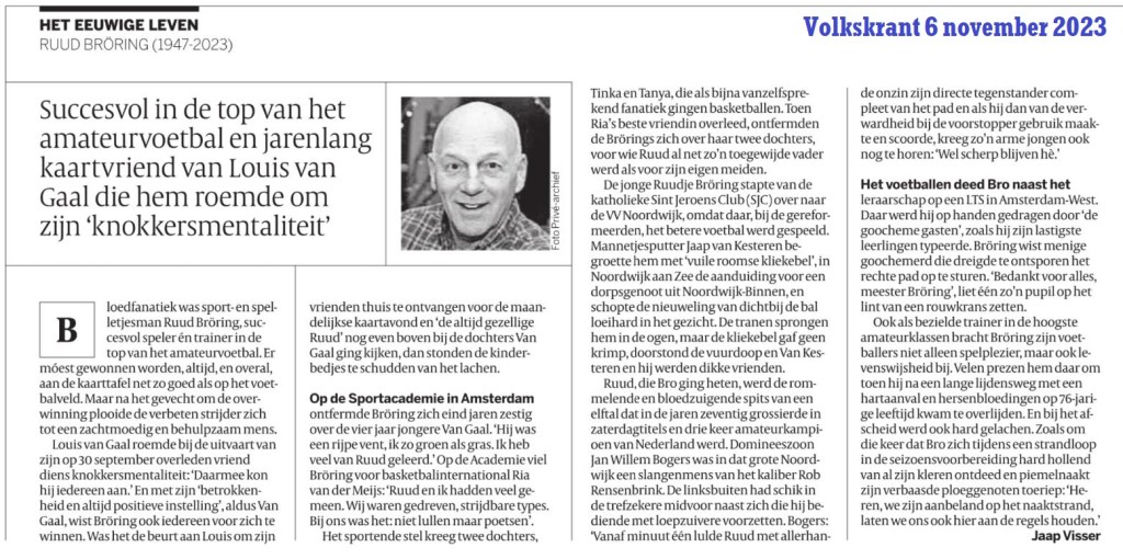 Eind september vorig jaar overleed Ruud Bröring, vermaard spits en later ook trainer van de vv Noordwijk. Ik schreef bij die gelegenheid een in-memoriaal blogje. Nu kom ik in mijn archiefje een in memoriam tegen uit de Volkskrant van 6 november. En ook – ter illustratie van alle humor die ‘de Bro’ kenmerkte en waarvan bij zijn overlijden ook gewag werd gemaakt – een hilarisch sinterklaasverhaal van hemzelf uit het Leidsch Dagblad van 6 december 2004: