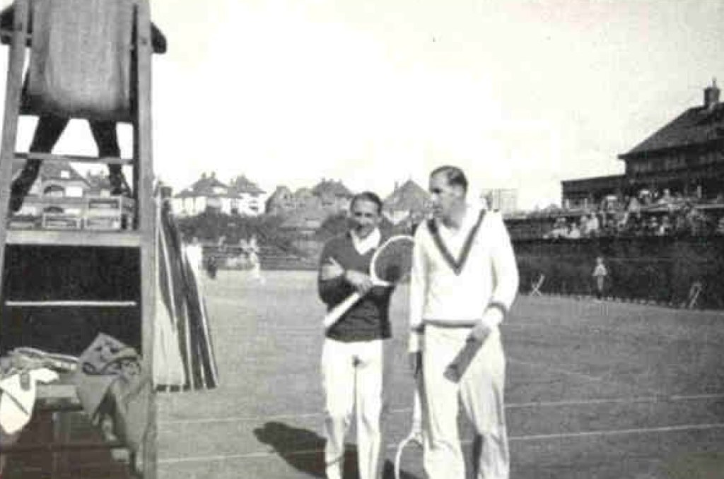“De tennisvelden van rood baksteen liggen dicht bij Huis ter Duin. Er zijn 18 banen. Voor de toernooien komen vaak beroemde gasten, zoals hier (rechts) Tilden en Prenn.” De foto is waarschijnlijk genomen tijdens het internationale kampioenschap van Nederland, dat van 8 tot 13 juli in Noordwijk werd gehouden. In de finale van het herendubbel joegen Bill Tilden en Daniël Prenn het Nederlandse koppel Henk Timmer en Arthur Diemer Kool met 6-1, 6-2 en 7-5 de bietenbrug op. Daar hoefden ze niet eens hun trui voor uit te trekken.