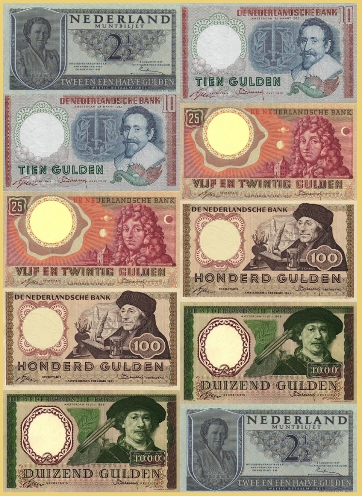 Doeve illustreerde veel voor Elseviers Weekblad, herinner ik mij. En hij ontwierp onderstaande bankbiljettenserie uit de Jaren Vijftig (waarvoor nooit een Noordwijker heeft geposeerd):