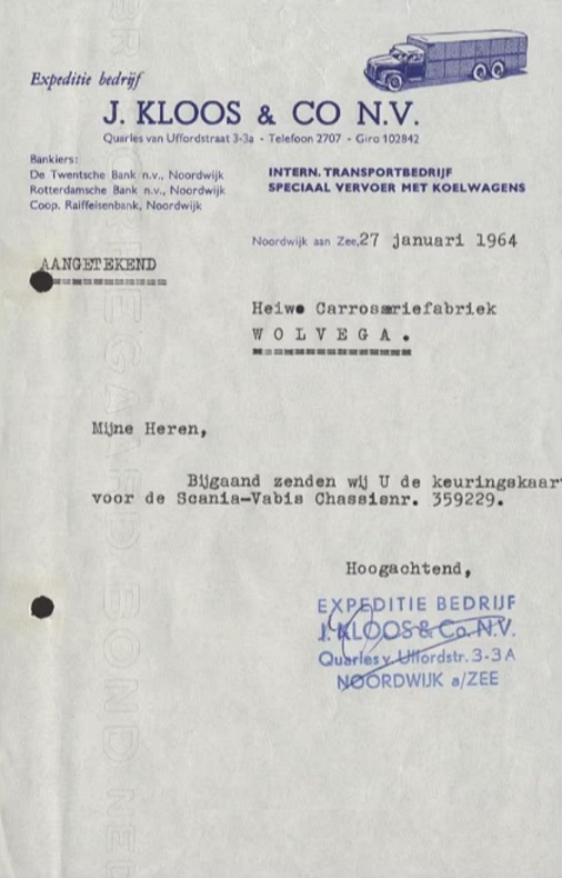 Brief van J. Kloos aan de Heiwo Carrosseriefabriek in Wolvega. Blijkbaar moest de fabriek eerst over een fatsoenlijk keuringsrapport beschikken van het motorrijtuig, alvorens dat op te tuigen met een koelbare opbouw voor het vervoer van vis.