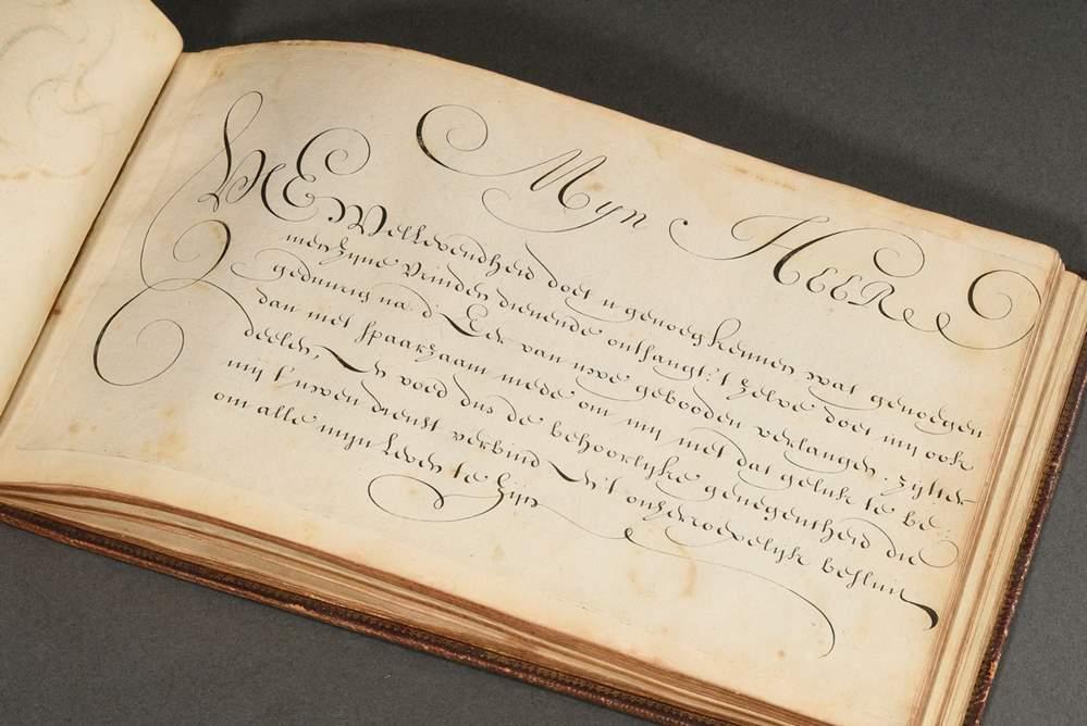 Binnenkort komt bij Veilinghuis Kendzia in Hamburg een boek te koop, uitgegeven in Noordwijk in 1689. Het gaat om het mooi gekalligrafeerde werk van de hand van ene Michiel Komans, getiteld “Dienstige Voorschriften Voor de Leergierige inde Schryvkonst / Geschreeven en Gesneeden door Michiel Komans.” Deze Michiel Komans was geen Noordwijker van geboorte, waarschijnlijk kwam hij uit Amsterdam. Tenminste als we afgaan op een advertentie in de “Extraordinaire Haerlemse Donderdaegen Courant” van 19 Februari 1688: “Michiel Komans, die tot heden te Amsterdam schoolgehouden en sig nu innet school van sijn overleden vader tot Noortwijck begeven heeft presenteert sijnen dienst en sal nevens goet tractement sijn discipelen onderwijsen in ‘t Lesen, grondig Schrijven, Tekenen, Rekenkonst en ‘t „Koopman” of Italiaensch Boekhouden, de kortste en koopmans-gebruijckelijcke maniere, nevens een continueele ondewijsing en oefening in de Franse tael en hopen van ijegelijek goet genoegen te geven”.