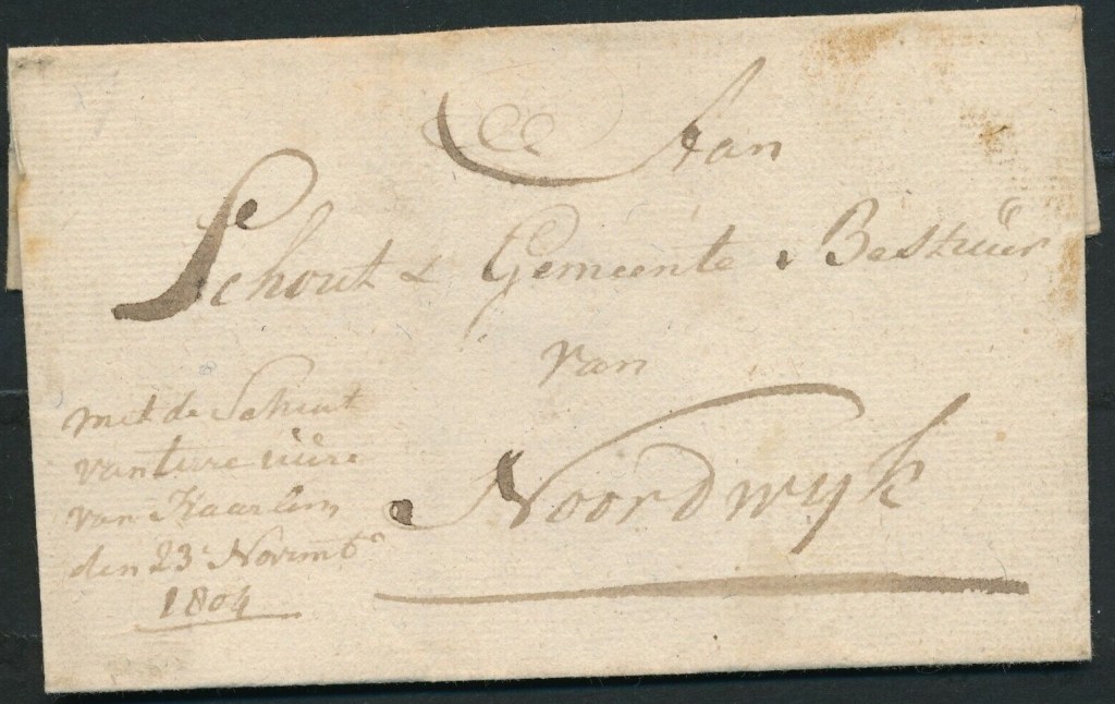 Wie de schout van Noordwijk was in 1804 kan ik zo gauw niet verzinnen. Feit is dat hem een brief werd gezonden vanuit Haarlem. Dat ging “met de schuit van twee (?) ure van Haarlem den 23 november 1804”.