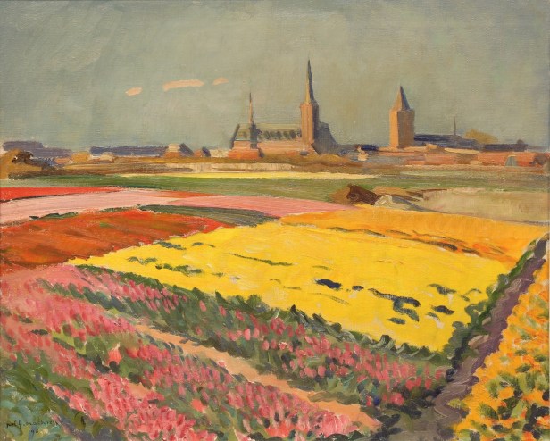 Onlangs hadden we een schilderij te pakken van de Amerikaanse schilder George Hitchcock: gezicht op Noordwijk Binnen. Dat schilderij moet zijn ontstaan ergens rond 1900 en toont naast de Hervormde Kerk ook de contouren van de nieuwe Katholieke Kerk, die toen nog maar voor de helft was afgebouwd. Het wat petieterige torentje van de toenmalige Waterstaatskerk staat er ook nog op.