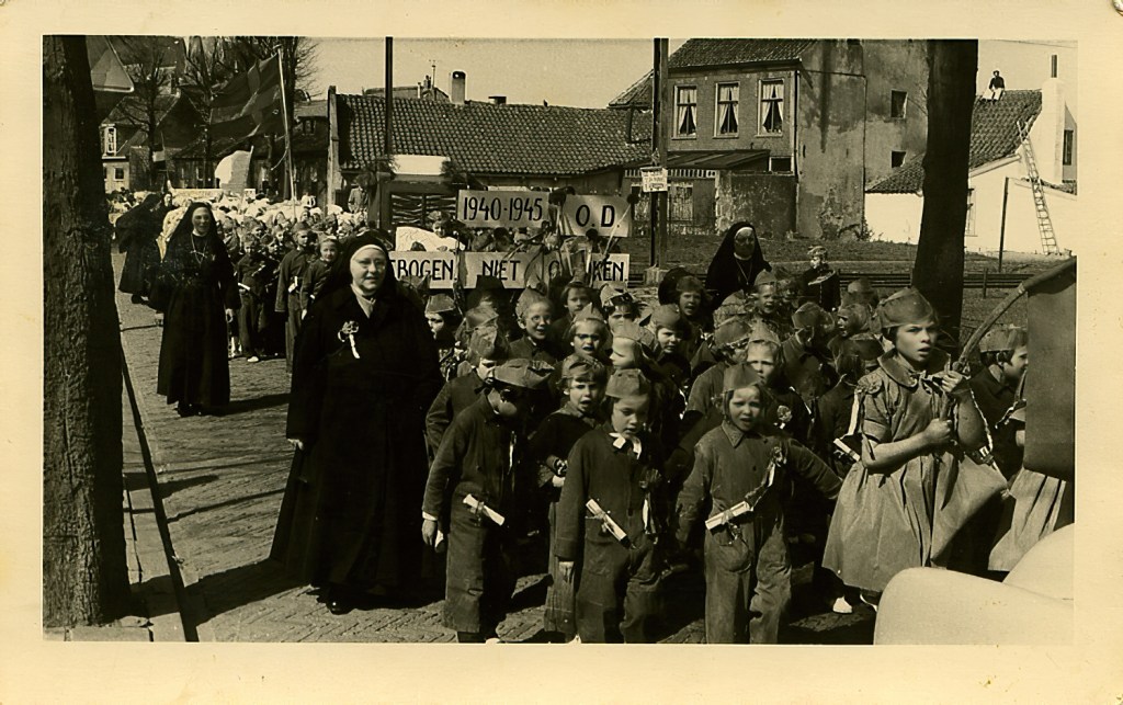 Dezer dagen 79 jaar geleden trok deze stoet van kinderen over de Heilige Geestweg, waarschijnlijk als onderdeel van de Grote Bevrijdingsoptocht die toen door het hele dorp trok. Of misschien was het later – ter herdenking van die bevrijding – want de kinderen zien er redelijk florissant uit. In 1945 moeten ze er slechter hebben uitgezien. Alles begeleid door de nonnen van JMJ uit de Bronckhorststraat. De foto is van Gill op “Je bent een Keune Noortukker.” Op de onerste borden staat “Gebogen, Niet Gebroken”. Waar “O.D.” voor stond weet ik niet.