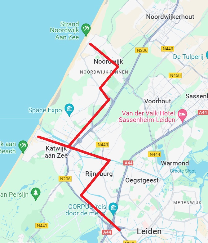 Ik weet niet meer zo goed hoe men dat indertijd voor zich zag. Maar een lijn van Leiden naar Katwijk en Noordwijk had er – voor het vaderland weg getekend – ongeveer zo uit kunnen zien: