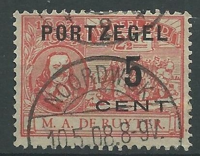 De zegel (opgewaardeerd naar 5 centen) werd vandaag precies 116 jaar geleden, op 10 mei 1908, in Noordwijk afgestempeld. Een zegel met de beeltenis van Michiel Adriaanszoon de Ruyter, uitgegeven in een serie van 3 bij gelegenheid van diens 300e geboortedag.