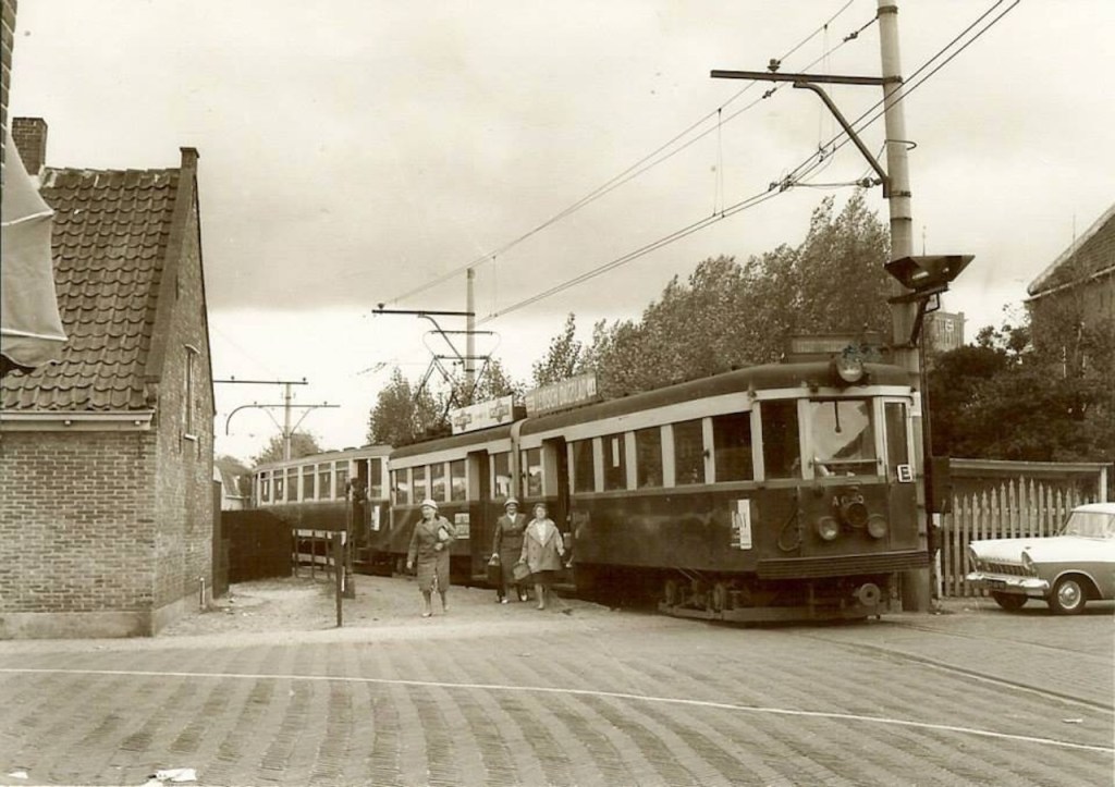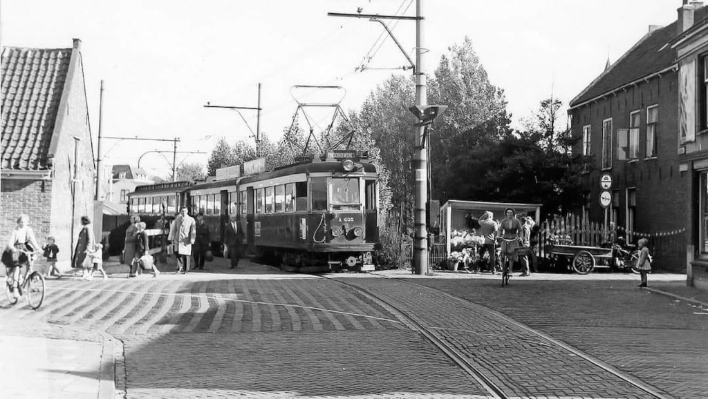 Twee vrijwel identieke trams die een aanloop naar de Zeestraat nemen. Rechts het bloemenstalletje van Good Old Paultje Christiaanse, zonder en mét bedrijvigheid.
