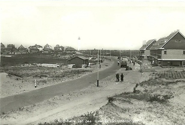 De Quarles van Uffordstraat nog in aanbouw. Vrijwel de gehele straat, de huizen incluis werd ontwikkeld door de befaamde Haagse architect Co Brandes (die eerder ook voor het oude Palace Hotel tekende (zij het in dienst van het architectenbureau van oud-Noordwijker Zacharias Hoek).