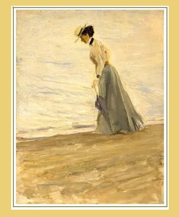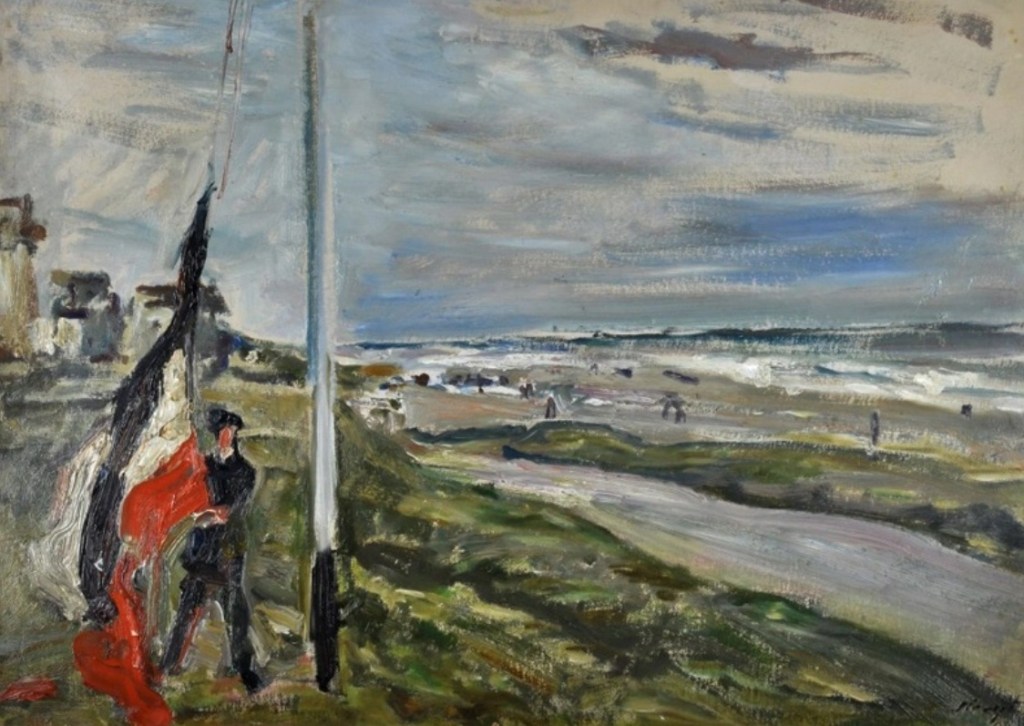 Dit schilderij – “Mosselvisser aan het strand van Noordwijk” – is van de hand van de Duitse schilder Max Slevogt. Slevogt logeerde in 1908 samen met zijn Duitse collegae Lovis Corinth enkele dagenbij de Duitse galeriehouder Paul Cassirer in diens villa aan de Noordboulevard. De onvermijdelijke Max Liebermann gaf ook acte de présence. Op een dag gingen deze drie Duitse impressionisten samen aan de gang met verf en penseel en doek. En aan die dag – “Ein Tag am Meer” – werd enkele jaren geleden een hele tentoonstelling gewijd in het Landesmuseum in Mainz (D).