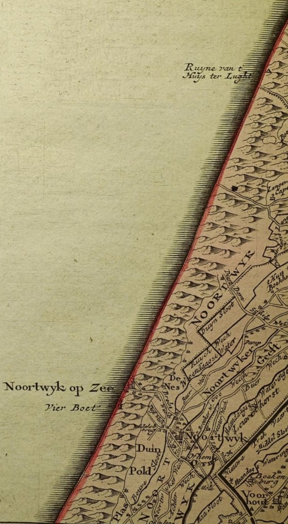 De kaart is onderdeel van de “Nieuwe en zeer nette kaart van Zuyd-Holland, ’t Sticht van Utrecht, en een Gedeelte van Gelderland, Afgedeeld in Heemraadschappen, Baljuwschappen, Heerlykheden, Waarden, Districten en Uytgeveende Waterplassen” Deze hele mondvol werd rond 1780 uitgegeven door ene P. Schenk in Amsterdam. Van Noordwijk aan Zee bestond nog niet meer dan een gebied begrensd door de tegenwoordige Hoofdstraat en Schoolstraat. En er was een vierboet (een vuurbaken)
