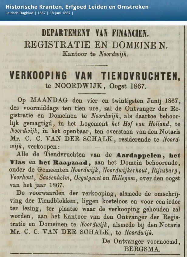 De “Ontvanger der Registratie en Domeinen te Noordwijk”, ene Bergsma belegde een verkoopsessie onder het toeziend oog van de notaris in het Hof van Holland. In de verkoop ging alles bij elkaar één/tiende van de aardappel-, de vlas- en de raapzaadoogst van 1867 uit verschillende dorpen in de regio. Hoe groot de opbrengst in geld was, kan ik niet meer achterhalen.