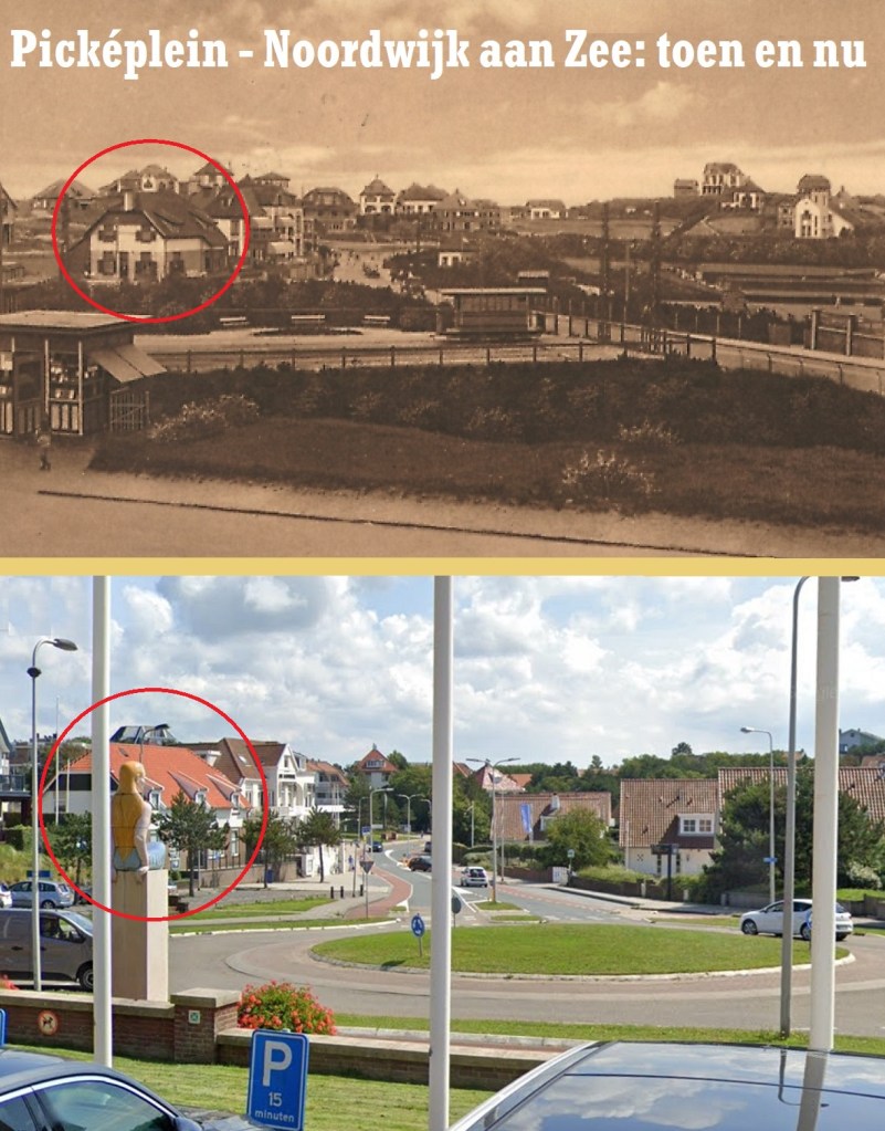 Twee foto’s van toen en nu, met als ijkpunt het omcirkelde pand links. Uit de prehistorie vang ik nog een ander beeld op van deze zelfde plek met hetzelfde ijkpunt: