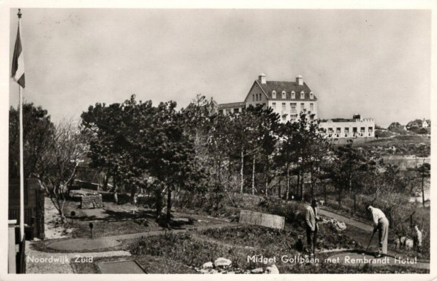 De kaart is in 1956 verzonden en rond die tijd moet er dus een midgetgolfbaan zijn geweest nabij het Hotel Rembrandt. Als ik het preciezer moet lokaliseren vermoed ik dat het dan aan de andere kant van de Beethovenweg zijn geweest, anders kan ik dit niet plaatsen.