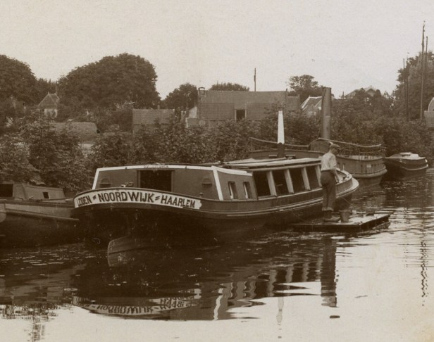 De boot die zich hier nogal zelfgenoegzaam laat spiegelen in het water van het Schie had het heen-en-weer van Leiden naar Haarlem en vice versa, steeds met als tussenstation Noordwijk. Wie de eigenaar van de dienst was weet ik niet. De boot ziet er uit als een oude trekschuit, die intussen ongetwijfeld motorische aandrijving had gekregen. Schuin achter deze boot lag de oude boot van Kleinpenning en later Plug, die zich beperkte tot de dienst Leiden-Noordwijk v.v. Die schuit hadden we al eerder in beeld.