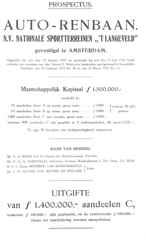 Eerder schreven we al over de ambities om in de Jaren Twintig van de vorige eeuw in Noordwijk een autorenbaan aan te leggen voor heuse Formule 1-reaces. Het kwam er niet van, maar de geschiedenis mocht er wezen (zie ook een eerder artikel in De Blauwdotter en de prachtige Sportgeschiedenis-site van Jurryt van de Voorden). Voor de uitgifte van aandelen werd een prospectus beschikbaar gesteld, waaruit onder meer blijkt dat de Jonkheer Gevers er ook bemoeienis mee had: hij bezat een stukkie grond in de duinen daar (met dank aan Willem).