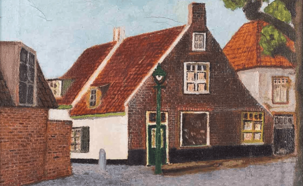 Twee (uitsnedes van) schilderijtjes van de hand van Jaap Vink. Begin Jaren Zeventig. Er zijn/waren veel Japen Vink, ik vermoed dat het in dit geval gaat om Jaap de sigarenhandelaar op de hoek van de Wilhelminastraat/Molenstraat. Hoewel ik niet wist dat hij überhaupt schilderde. Boven de Molenstraat (zelfde hoek Wilhelminastraat). Onder de Muizensteeg (later: Lindenhofstraat). Beide schilderijen te koop op museumdepotshop.