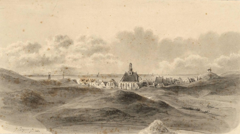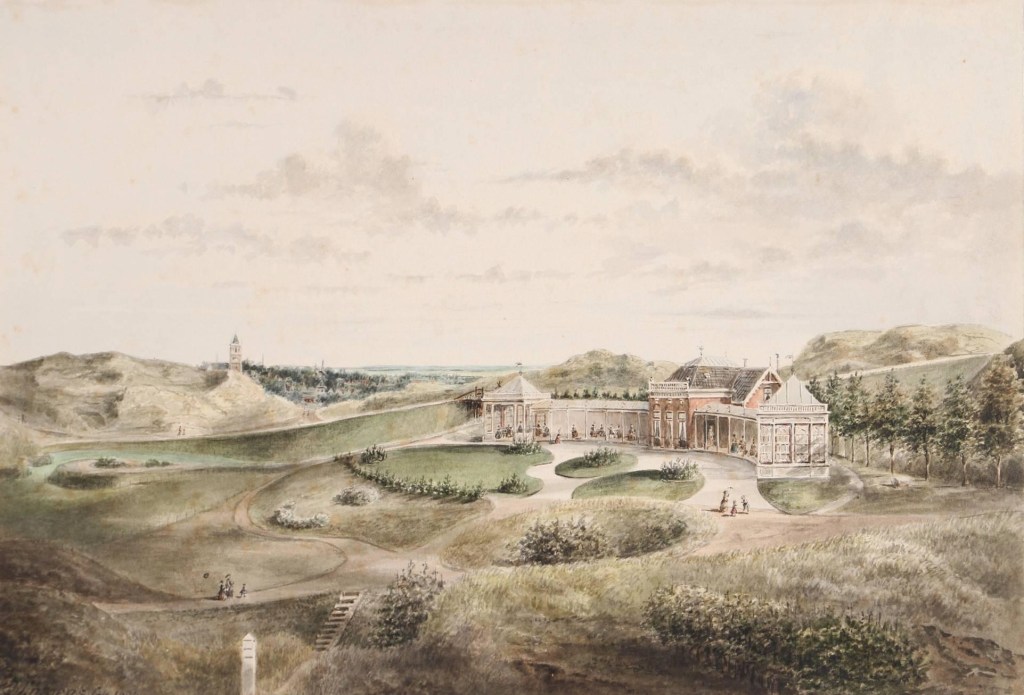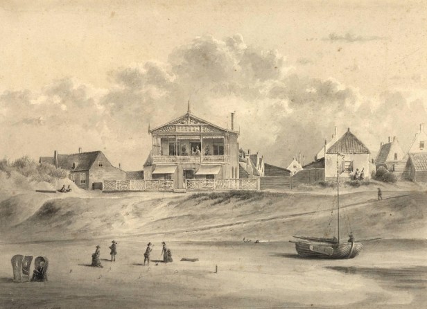 Deze en nog andere prenten van Jan Lutgens (1836-1919) zijn te koop op een veilingsite via invaluable.com. Hier gaat het om de dependance van Instituut Schreuders , gezien vanaf het strand. Nog geen biedingen. Inzet €100 tot € 200.