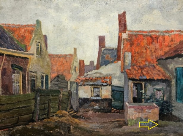 Schilderij aangeboden op catawiki. Bijschrift: “Schitterende impressionistisch, en plein air geschilderd, gezicht op een straatje met vissershuisjes in Noordwijk. In olieverf op doek rond 1930 geschilderd door een onbekende maar goed opgeleide schilder uit de Haagse School.” De suggestie als zou het hier om een beeld uit Noordwijk gaat valt misschien af te leiden uit een vage aantekening op het schilderij zelf. Zie uitvergroting.