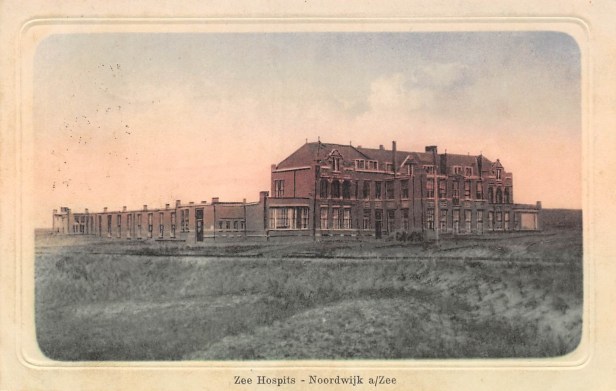 De uitgever van deze kaart was de door mij eerder bewierookte firma “J.H. Schaefer’s Elektra Iris Edition uit Amsterdam.” Maar hier ging de firma toch even de mist, zo niet een dichte zeevlam in: het Zeehospitium stond niet in Noordwijk, maar in Katwijk aan Zee. Het hospitium kreeg in de loop der tijden steeds andere functies, maar het was in 1908 geopend door koningin-moeder Emma en stond toen bekend onder de naam ‘Rotterdamsch Hospitium’. Het diende toen nog uitsluitend als sanatorium voor kinderen met tuberculose en de frisse zeelucht was een belangrijk onderdeel van de kuur. Het hospitium lag in de duinen en via een speciaal tunneltje, dat in 1933 gebouwd werd, konden de kinderen naar het strand gebracht worden.
