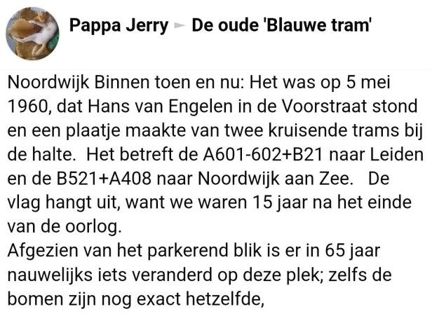 Op de facebook pagina “De Oude Blauwe Tram” verschijnt regelmatig de één na de andere plaat van Noordwijk in het gouden tijdperk van de Blauwe Tram. Zoals bovenstaand schitterend beeld uit de koker van “Pappa Jerry” (niet mijn pappa), die er nog het volgende bijschrift aan toevoegt: