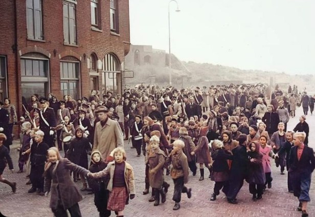 Het was een optocht, maar bij welke gelegenheid? De aandoenlijke foto verschijnt lichtelijk ingekleurd op facebook. Midden op de achtergrond nog de restanten van de oude Villa Seehorst, die op last van de Teutoonse bezetter moest worden afgebroken. Half werk, zoals nog tot midden Jaren Vijftig was te zien.