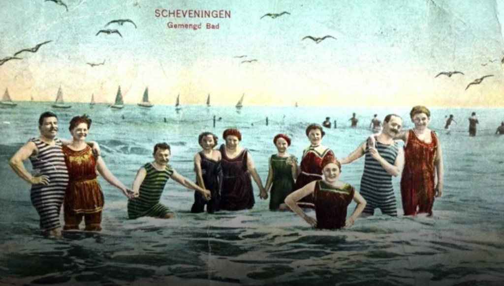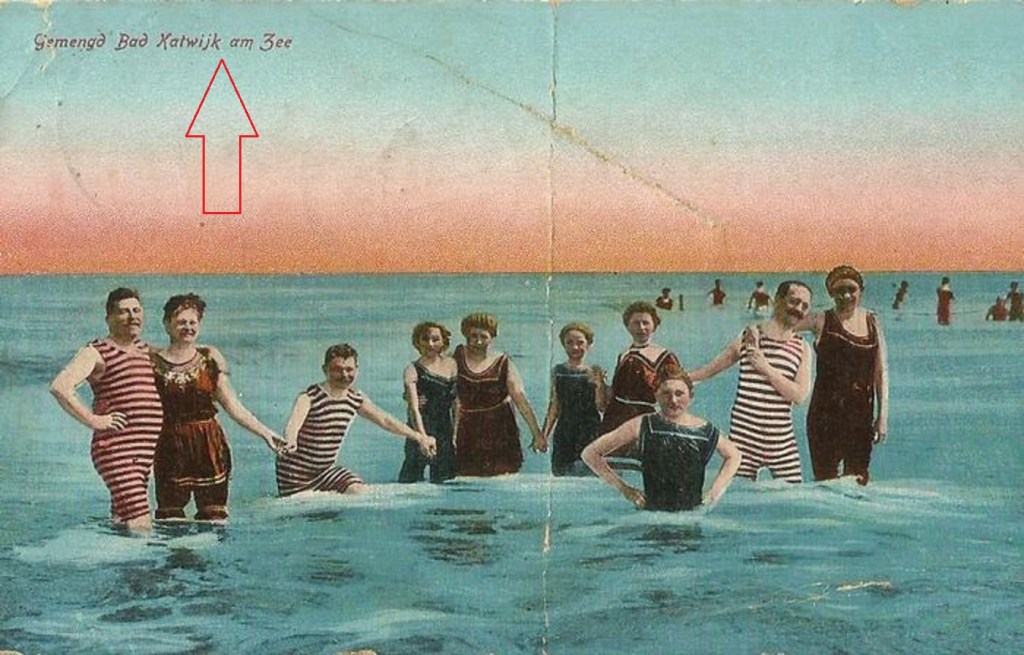 “Gemengd Bad Noordwijk am Zee” luidt het bijschrift. Het is allemaal half Duits en half Nederlands, mais soit (dat is Frans). De foto had echter overal gemaakt kunnen zijn. Bijvoorbeeld in “Katwijk am Zee”: (waarschijnlijk toch de laatste plek op aarde waar gemengd zwemmen was toegestaan):