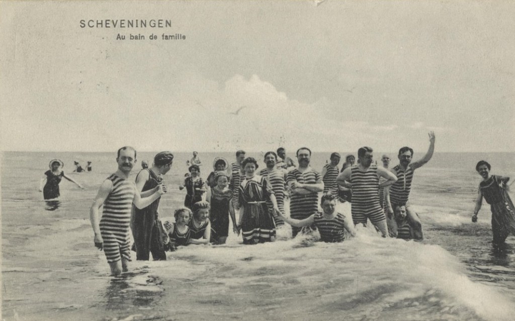 En dat was de enige en waarachtige plek waar de originele foto geschoten is. Want met een verwijzing naar Scheveningen treffen we een onderstaande foto aan in het Haags Gemeentearchief, niet precies dezelfde, maar wel met enkele personen, die ook op de bedoelde kaartenreeks aanwezig waren. En dan heet het allemaal geen ‘gemengd bad’ meer te zijn, maar een ‘familiebad’: