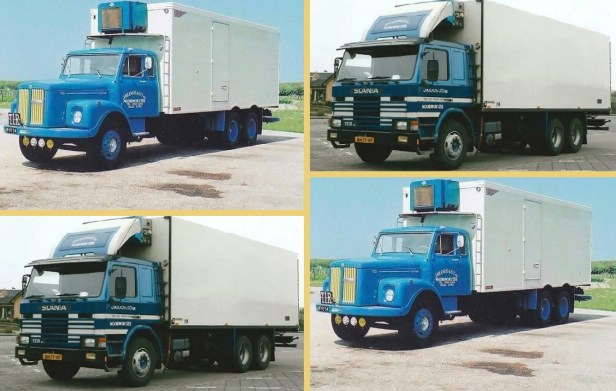 Twee keer twee Scania’s van de firma J. Kloos (toen nog in Noordwijk). Verschillende types uit verschillende tijden. Opmerkelijk verschil: de oudere Scania (de lichtblauwe) wilde nog niets weten van stroomlijn, windshield, minder brandstofgebruik or whatsoever. Hij ving veel wind, maar wellicht was dat juist nodig om het pontificaal geplaatste koelapparaat goed te laten werken?