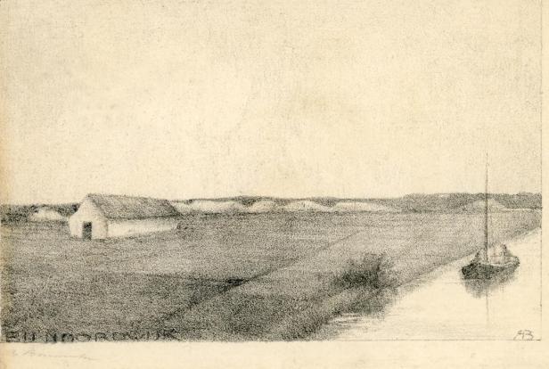 “Bij Noordwijk” staat er linksonder. Een merkwaardige tekening uit de nalatenschap van Cor Warmenhoven. Cor had deze tekening (van ene ‘Bouwmeester’ als ik het onderschrift goed kan lezen?) in zijn verzameling opgeborgen onder het kopje ‘Schiestraat’ . Moeilijk te traceren, maar aan de (vage) achtergrond te zien (duinen?) lijkt het me niet een beeld van de Schiestraat.