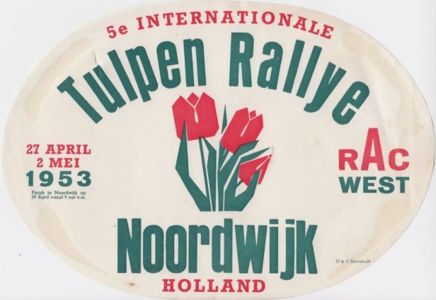 Sticker van de Tulpenrallye van 1953, “Finish te Noordwijk op 29 april vanaf 9 uur v.m.” De sticker werd gedrukt door D&C Noordwijk, wat stond voor ‘Dekker & Co”. Dat ‘Dekker & Co’ had eigenlijk ‘Dekker & Ko’ moeten zijn, zie een eerder blog.