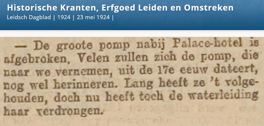 Een tijdje geleden hadden we hier wat klein verdriet aan de hand. In Noordwijk aan Zee miste men een pomp, althans men wist niet waar de pomp gebleven was, die nog rond de vóórvorige eeuwwisseling het Calisplein, annex Palaceplein sierde. Er was übrhaupt niet veel bekend over het ding, terwijl men nota bene in Noordwijk Binnen drie (3!) pompen keurig had geconserveerd voor de eeuwigheid. Ik vrees het ergste voor de Zeeërs, want vermoedelijk is het ding simpelweg aan de slopershamer ten onder gegaan. Dat concludeer ik tenminste uit een bericht in het Leidsch Dagblad van 23 mei 1924. Ik oet zeggen en schrijven – met alle respect voor Zeeërs – dat die pomp op het Calisplein het niet háálde bij die twee pompen op het Lindenplein en die ene pomp bij het Raadhuis.