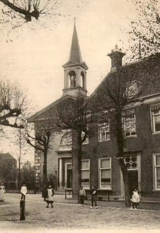 Prachtig beeld van de oude RK Waterstaatskerk en de aanpalende (oude) pastorie aan de van Limburg Stirumstraat in Noordwijk Binnen. Met linden en al. Er wordt geposeerd door nieuwsgierige kinderen. Eén van de jongens in het midden van de foto zou mijn opa geweest kunnen zijn.