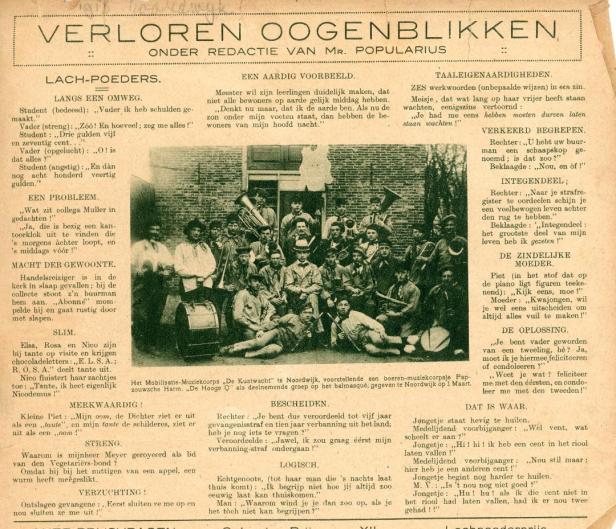 Het ziet er allemaal vrolijk uit. Maar uit welke publicatie het plaatje komt, kan ik niet traceren. Datering is 1 maart 1918 en dat kan wel overeenkomen met het gegeven dat het hier om het “Mobilisatie-Muziekcorps De Kustwacht” ging, want gemobiliseerd werd er in maart 1918 in Noordwijk nog volop. Dat muziekcorps zal men wel een beetje uit verveling hebben opgericht, want veel viel er niet te doen in Noordwijk in WO I.