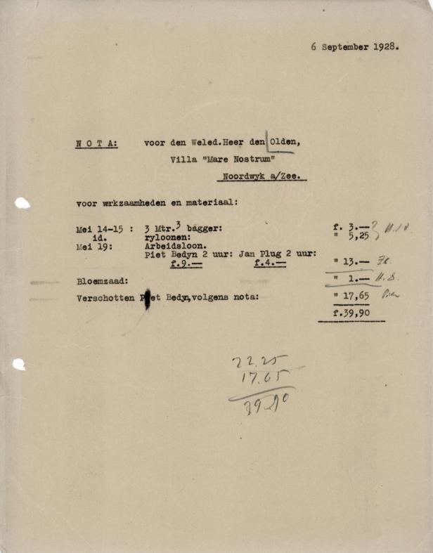 Nog een nota waar Piet Bedijn Jr. bij betrokken was. Een nota voor de heer den Olden van de Villa “Mare Nostrum” in de Zuid. Voor onder meer het leveren drie kuub bagger en wat bloemzaad. Schijnbaar moesten de woeste duingronden rond Mare Nostrum enige bemesting krijgen om er tenminste íets op te laten groeien.
