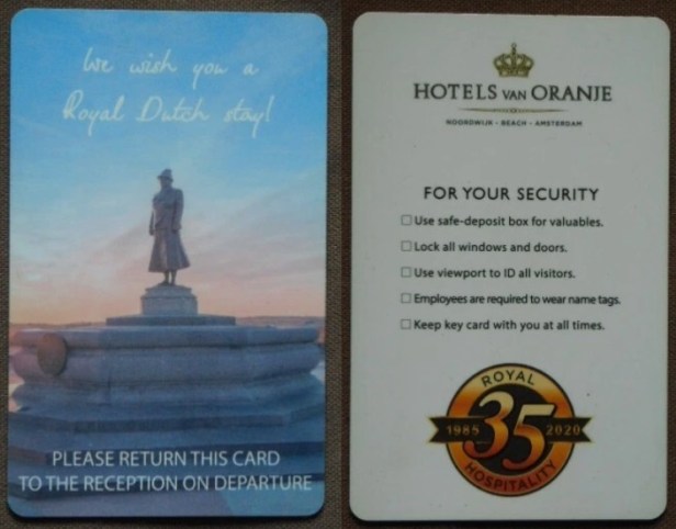 Een sleutelkaart van Hotels van Oranje aan de Koningin Wilhelminaboulevard met op de ene kant een foto van het standbeeld van Koningin Wilhelmina. Koningshuiselijker kan bijna niet.