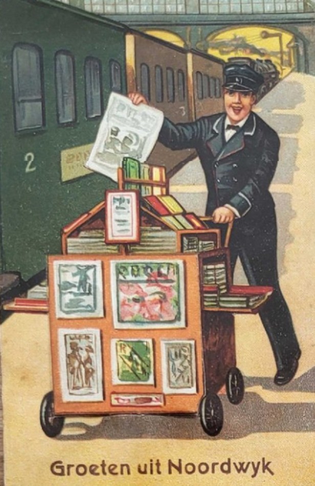 Zo’n kaart die heel vaak werd uitgegeven: een plaatje met daaronder “Groeten uit….”. Die groeten konden overal vandaan komen, in dit geval blijkbaar uit Noordwijk. Maar het beeld klopt natuurlijk voor geen meter: Noordwijk had / heeft geen treinstation en ook niet zo’n vrolijk type dat zijn kranten en tijdschriften slijt op het perron.