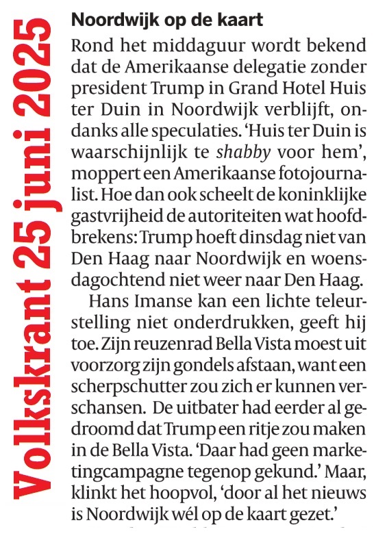 Uncategorized Blog14650: Trump in Noordwijk Datum: 25 juni 2025Auteur: Pjotr 2 Reacties ………. o nee, toch niet (maar Huis ter Duin te shabby?) Dit delen: Klik om te delen op X (Opent in een nieuw venster) X Klik om te delen op Facebook (Opent in een nieuw venster) Facebook Vind-ik-leuk Aan het laden... Gerelateerd