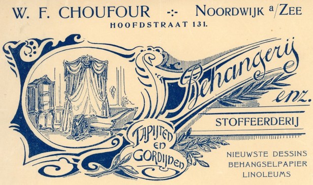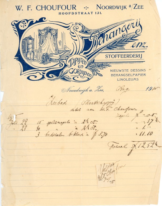 Toch nog één die ik van Willem aangereikt krijg. Een uitbundige ook voor een firma die zich specialiseerde in behangerij en stoffeerderij. Choufour zat aan de Hoofdstraat, maar begon later ook een nering aan de Albert Verweijstraat, als ik me niet vergis. De zo rijk versierde rekening betrof het bekleden van 3 badstoelen ten behoeve van de Maatschappij Zeebad Noordwijk: