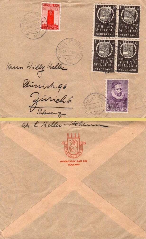 Een oranje envelop met daarop een reeks van postzegels met de beeltenis van Willem van Oranje. Deie serie werd uitgegeven in 1933 ter herdenking van het geboortejaar van deze ‘Zwijger’. En vooruit nog een postzegel van het reddingswezen erbij. Met de beeltenis van het monument voor het reddingswezen dat niet in Noordwijk maar in Den Helder staat.