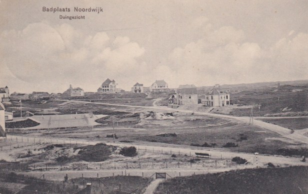Het lijkt erop alsof het wegennet hier nog maar net was aangelegd: het ziet er allemaal wat kaaltjes uit. Onderaan het samenvloeien van Rembrandtweg en Pickéweg (later Erasmusweg) en daarboven naar zee lopend de Oude Zeeweg. De tennisbanen van de Noordwijksche Sportvereeniging zijn er al wel, zij het nog niet de omvang die ze later zouden aannemen.