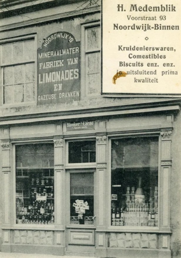 Nu was Medemblik geen schoolmeester or whatsoever, maar een gewone, zij het in Noordwijk welbekende kruidenier. Zijn etalages deden kond van allerhande producten die gewillig aftrek vonden, laatstelijk onder andere verschillende soorten koffie, thee en wasmiddelen (en een affche met aankondiging van een competitiewedstrijd van de v.v. Noordwijk tegen ‘…….Boys’, Rijsnburger, Quick of Kozakken.