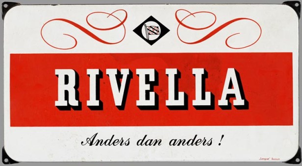Ik haal deze foto nog even uit de serie hiervoor: de twee bordjes die tegen de zijwand van het boter-kaas-en-eierenwinkeltje van de Weduwe Meijer bevatten een reclame voor een drankje van de Friesche Vlag: “Rivella, anders dan anders.”