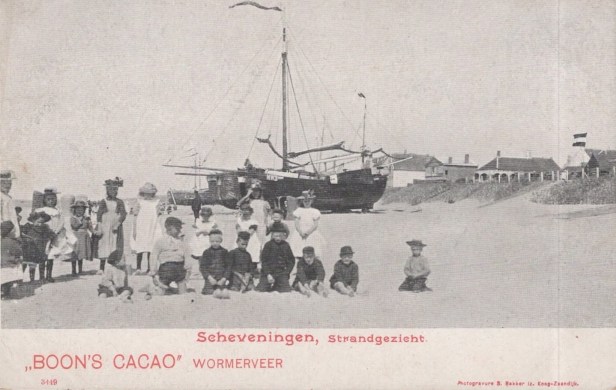 Volgens een ongeïnformeerde cacaofirma uit Wormerveer ligt de NW3 hier op het strand van …………….. Scheveningen! De kids op de foto wisten wel beter: ze bevonden zich mét die bommer gewoon op het strand voor het logement van de oude Konijnenburg in Noordwijk aan Zee en nerrugguns anders.