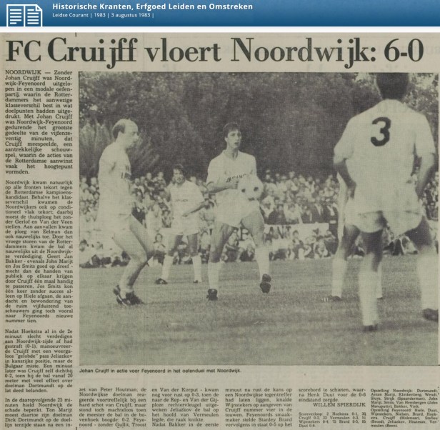 Op 2 augustus 1983 speelde Feyenoord ter oefening een potje zomeravondvoetbal in Noordwijk tegen de gelijknamige vv. Het werd 0-6 voor Feyenoord, maar dat was niet zo bijzonder. Bijzonderderder was dat aan Feyenoord-kant ene Johan Cruyff meedeed. Ik had het fenomeen wel eens eerder aan de Van Panhuys mogen aanschouwen, maar hij speelde toen nog bij Ajax, dat in die tijden regelmatig tegen de vv Noordwijk speulde. Feyenoord kwam zelden naar Noordwijk, maar toen die club kwam, nota bene mét Cruyff, was dat dubbel zo geweldig.